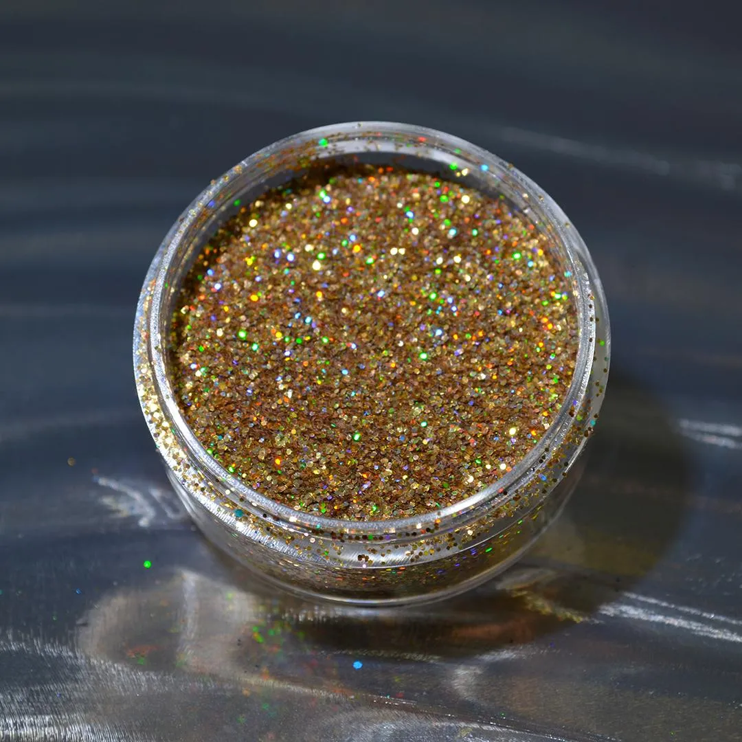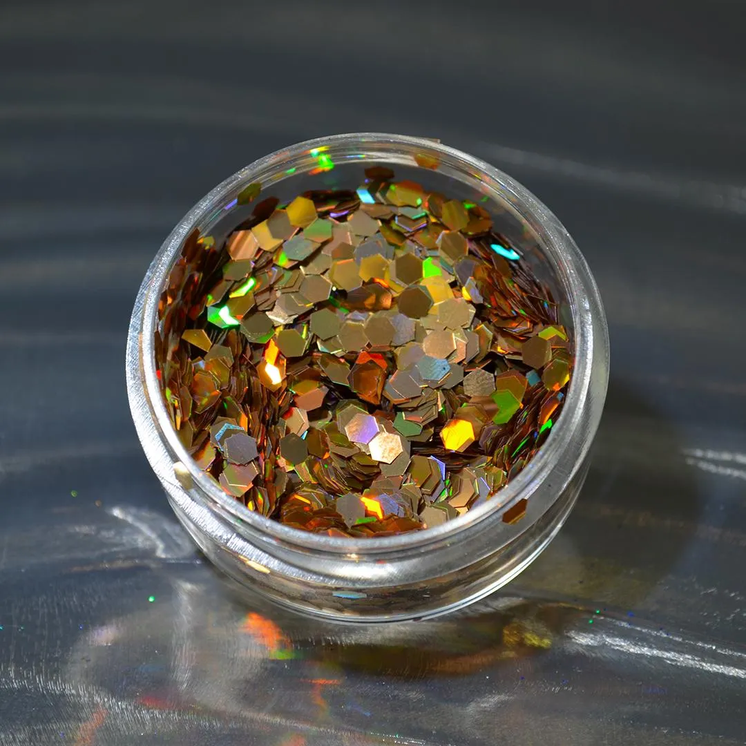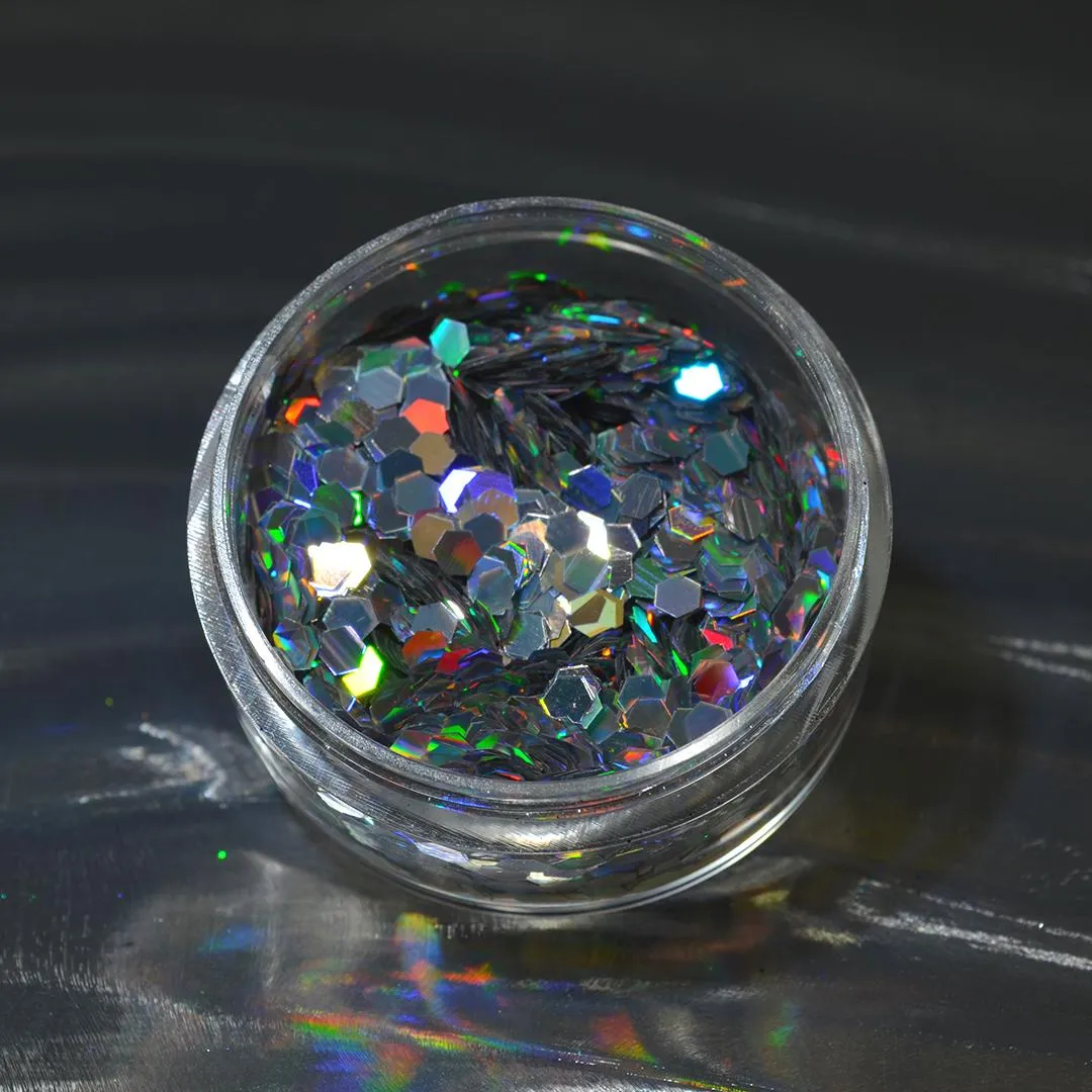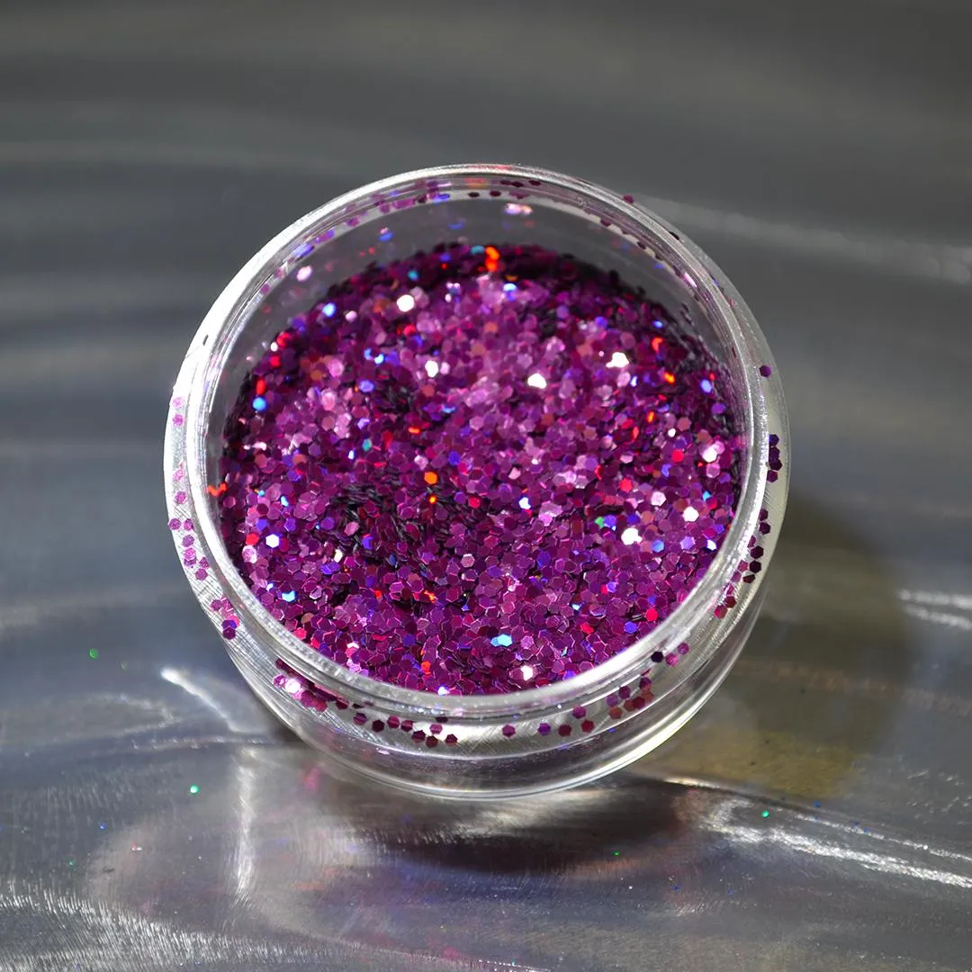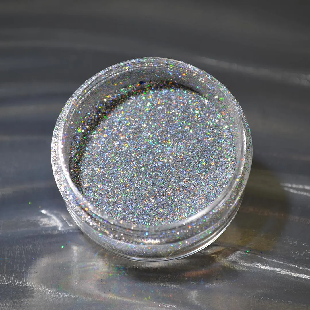 The geometric pigment particles have a thickness of 12 microns and come in various particle sizes. Available colors include holographic silver, gold, pink, purple, blue, black, clear, and more. These pigments are used in paints, coatings, nail polish, plastic molding, and inks. They are heat resistant and solvent resistant, making them versatile for many applications.